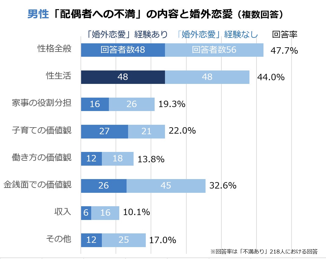 特に「不満あり」と答えた男性の実に47.2%が「婚外恋愛」を経験していることが分かりました。「不満なし」の男性と比べると、割合に圧倒的な開きがみられるのです。