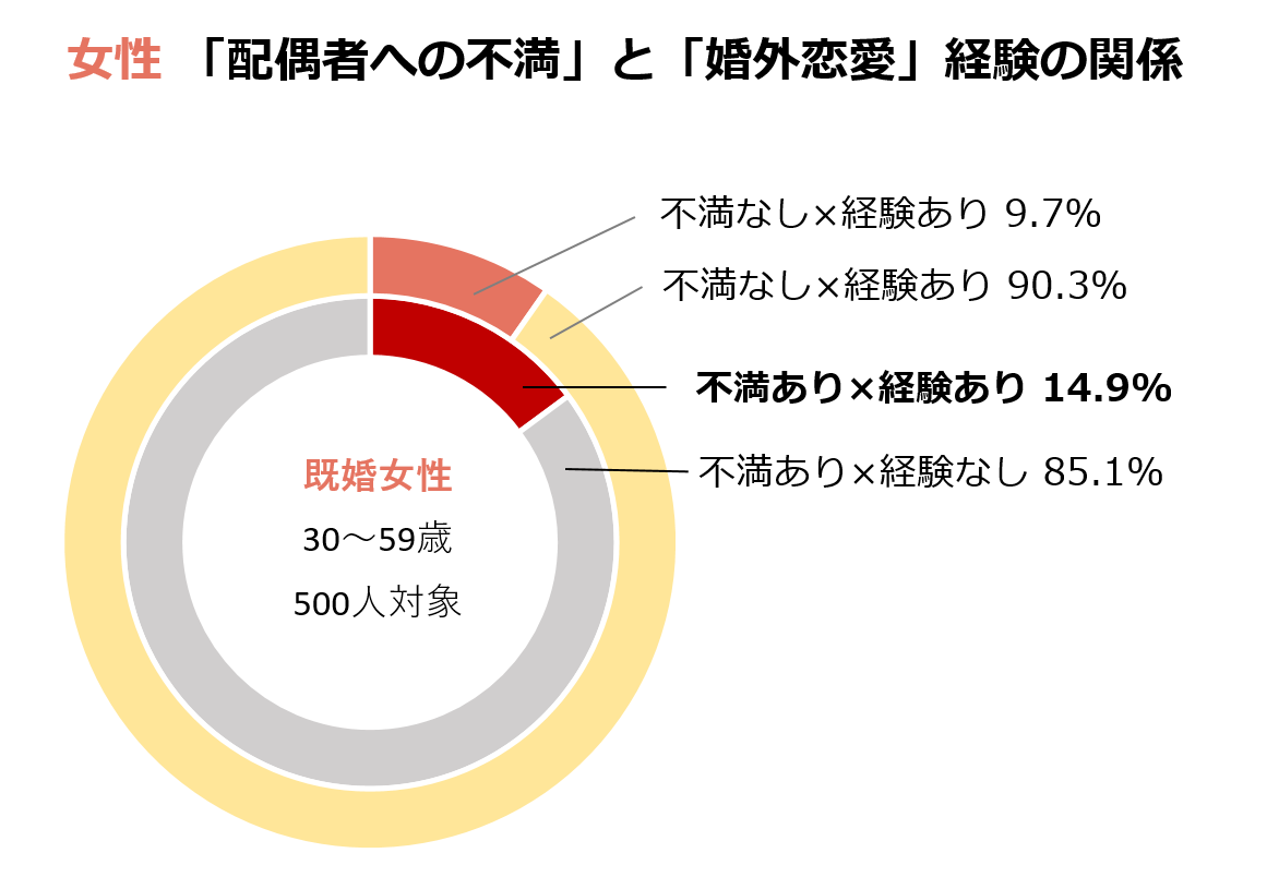 一方、女性の場合は「配偶者への不満」の有無で、男性ほどの差はみられません。この結果からも、男性が婚外恋愛に走る大きな要因の一つは「配偶者への不満」にあるといえるでしょう。