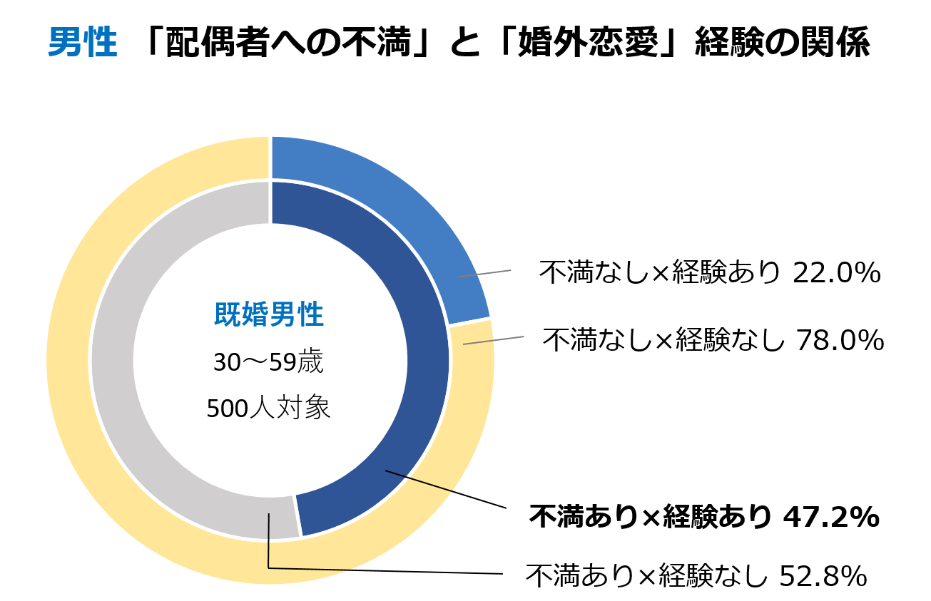 特に「不満あり」と答えた男性の実に47.2%が「婚外恋愛」を経験していることが分かりました。「不満なし」の男性と比べると、割合に圧倒的な開きがみられるのです。