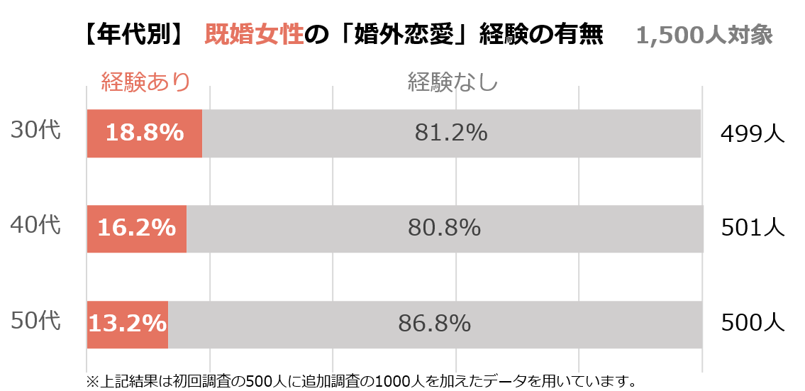 なお、今回は男女同数の1,000人を対象に初回調査を行った結果、女性の「婚外恋愛の経験あり」人数が少なかったため、女性1,000人を対象に追加調査を行いました。女性限定で内訳などを示す際は精度を高めるために初回・追加分を合わせた1,500人のデータを使用し、男女同数での比較が重要な場合は初回分のみの500人のデータを使用しています(グラフには注記を盛り込みました)。