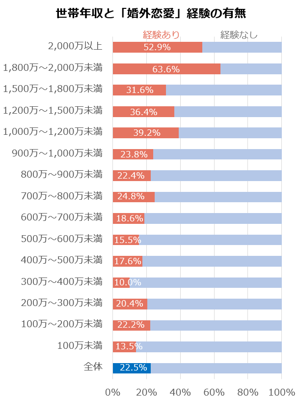 なお、世帯年収が高いと「婚外恋愛」経験者の割合が高くなる傾向は男性だけに限ったものではありません。年収1000万円超世帯の既婚女性(69人)の29.0%(20人)が「経験あり」と、既婚女性全体の16.1%に比べて明らかに高い結果となっているのです。