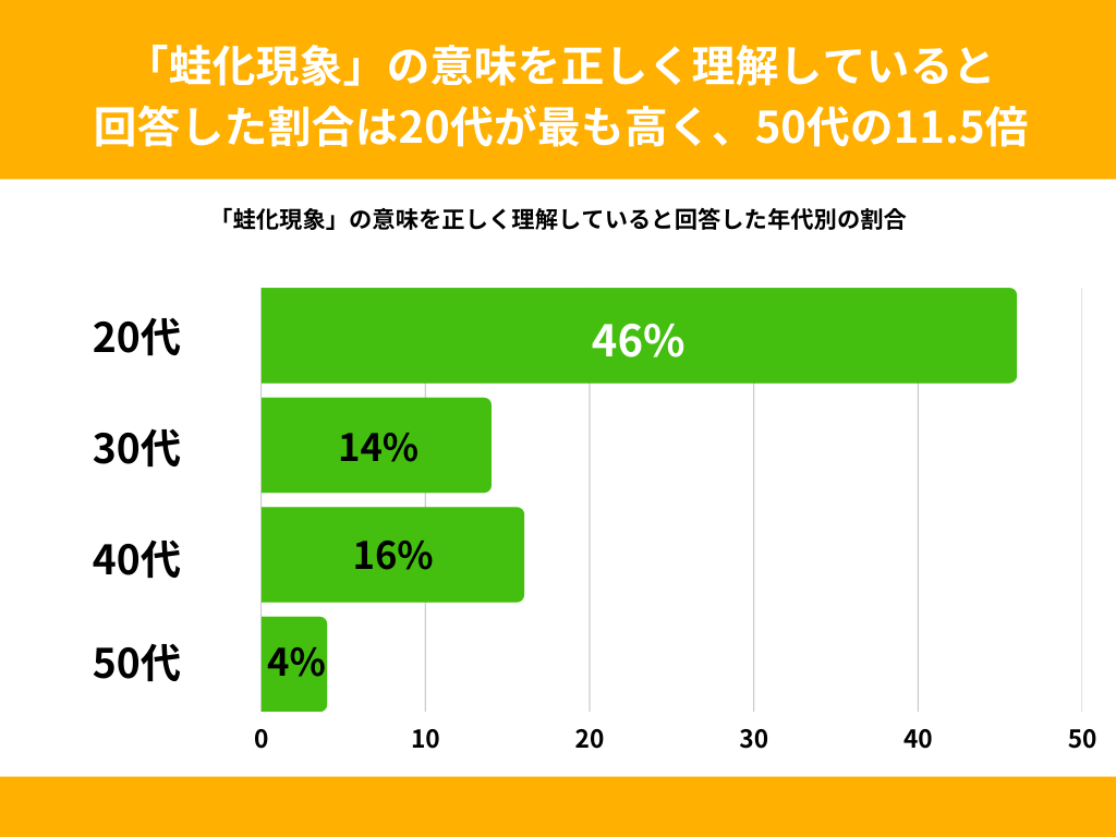 【「蛙化現象」の意味を正しく理解していると回答した割合は20代が最も高く、50代の11.5倍】