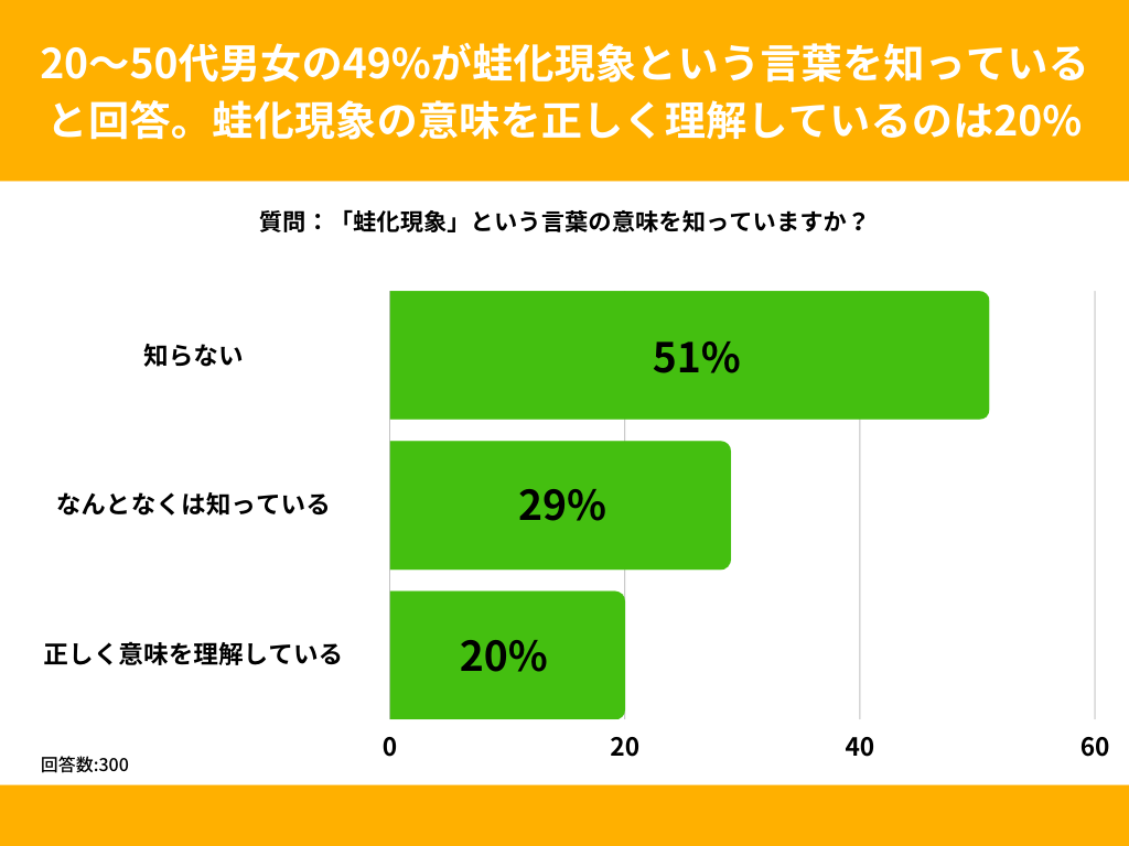 20代〜50代の男女を対象とした「蛙化現象という言葉の意味を知っていますか?」というアンケートで最も多かった回答は「知らない」で51%でした。