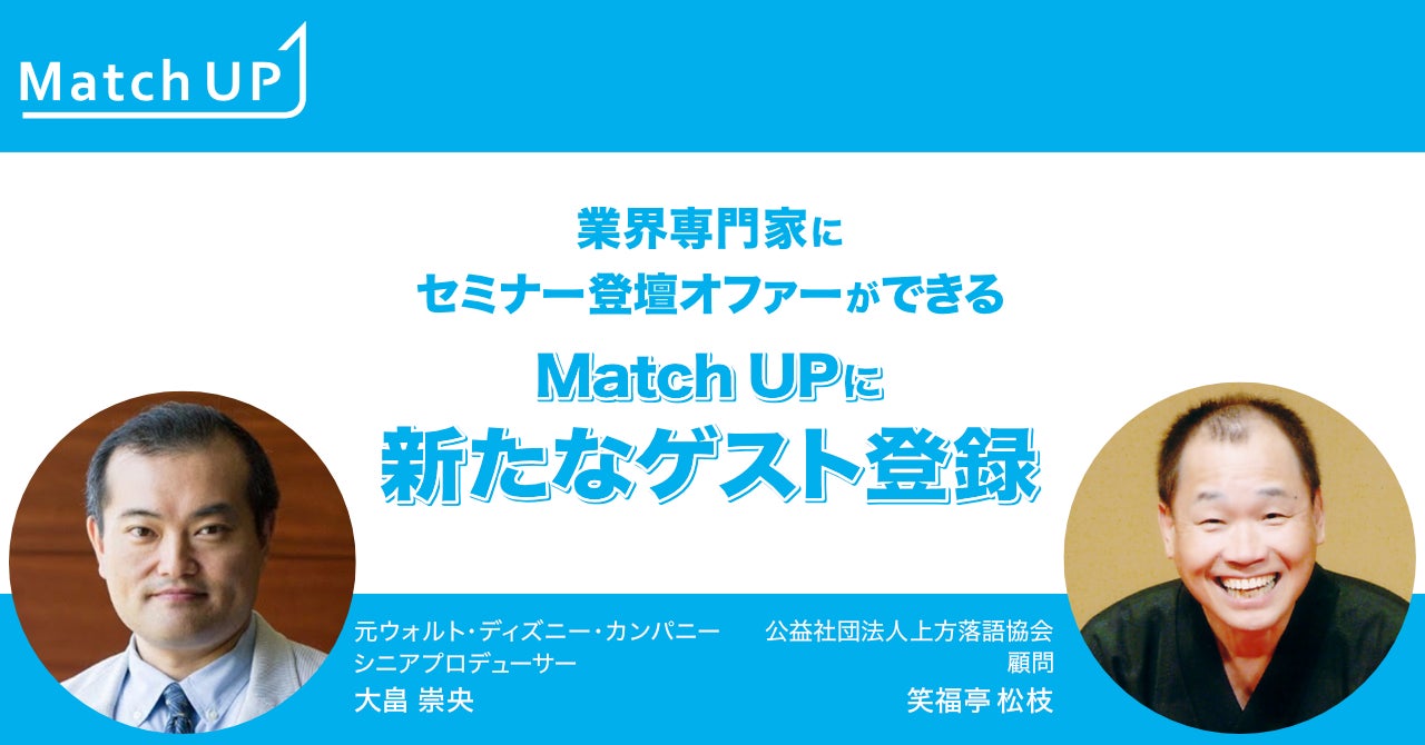 業界専門家にセミナー/イベント登壇のオファーができる「Match UP」元ウォルト・ディズニー・カンパニー 大畠 崇央氏、公益社団法人 上方落語協会 笑福亭 松枝氏などが新たにゲスト登録!