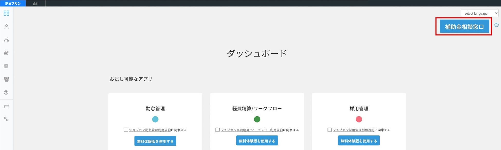 「ジョブカン」シリーズの有料プランご契約中で、管理者権限保持者のダッシュボードに表示される『補助金相談窓口』より特設サイトをご確認ください。