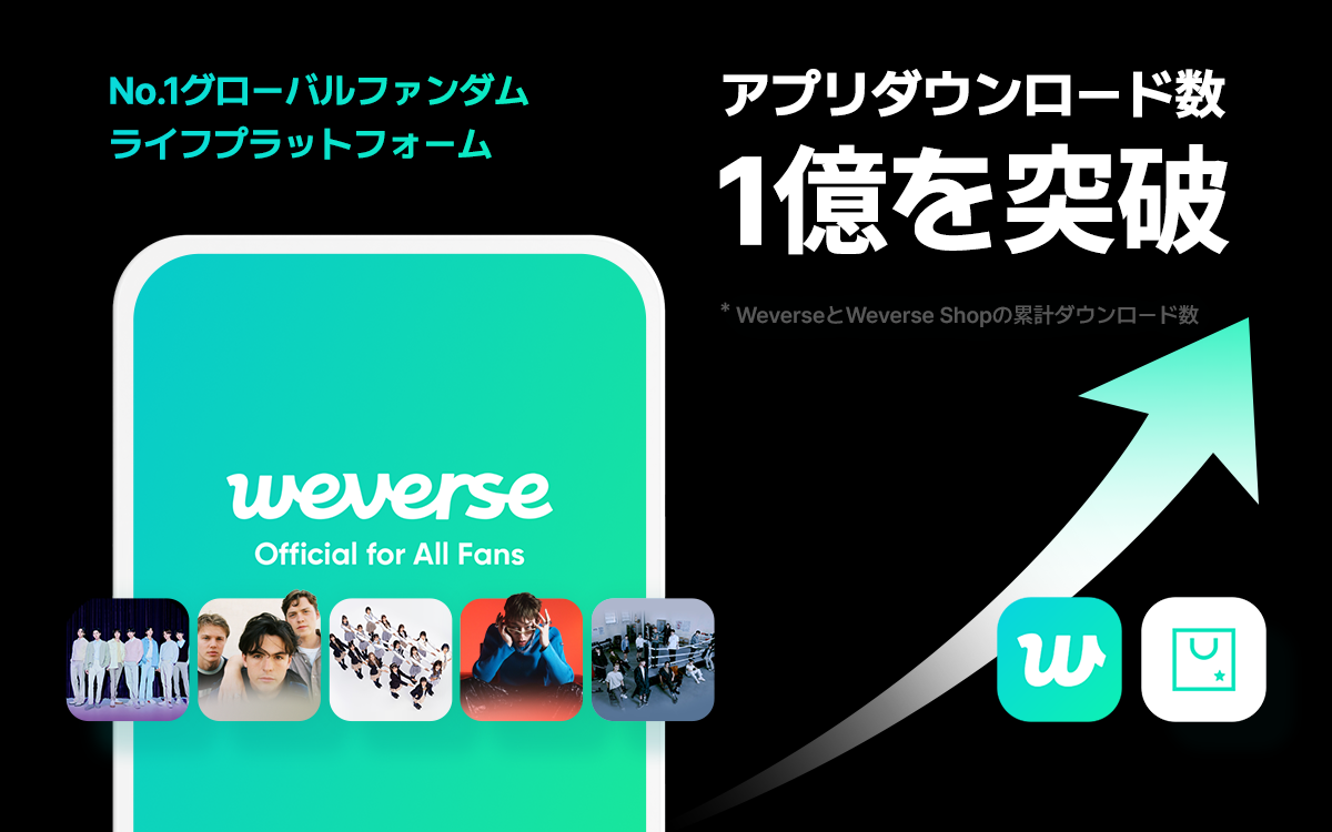 ファンダムプラットフォームWeverse(読み:ウィバース)の累計アプリダウンロード数が6月末に1億を突破しました。 これはコミュニケーション機能を中心としたファンダムプラットフォームWeverseと、コマースプラットフォームのWeverse Shopの合算ダウンロード数で、ファンダムプラットフォームのダウンロード数が1億を超えたのは初めてとなります。