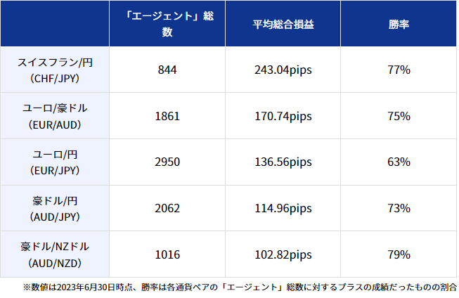 通貨ペアごとの「エージェント」全体の平均総合損益を比較すると、6月のTOPはスイスフラン/円でした。平均総合損益が243.04pipsで、勝率は77%。4月はTOP5にランクインしており、5月で調子を落としたものの、6月にまた調子を上げました。