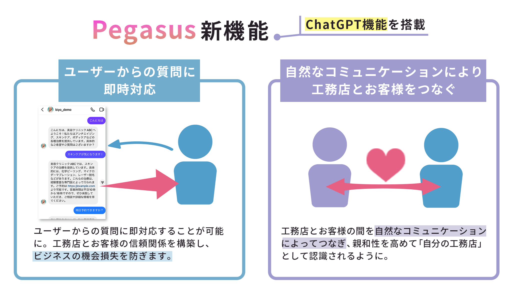 Pegasusの新機能であるChatGPTを活用することで、いつでも、ユーザーからの問い合わせに