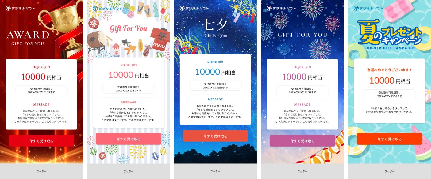 デジタルギフト®は、キャンペーンを通じた販促はもちろんのこと、PR動画視聴、抽選機能などの多彩なコンテンツ提供を通じて、企業ブランドを印象付け、ファン・マーケティングに貢献いたします。今後も続々と新デザインが登場する予定でございます。