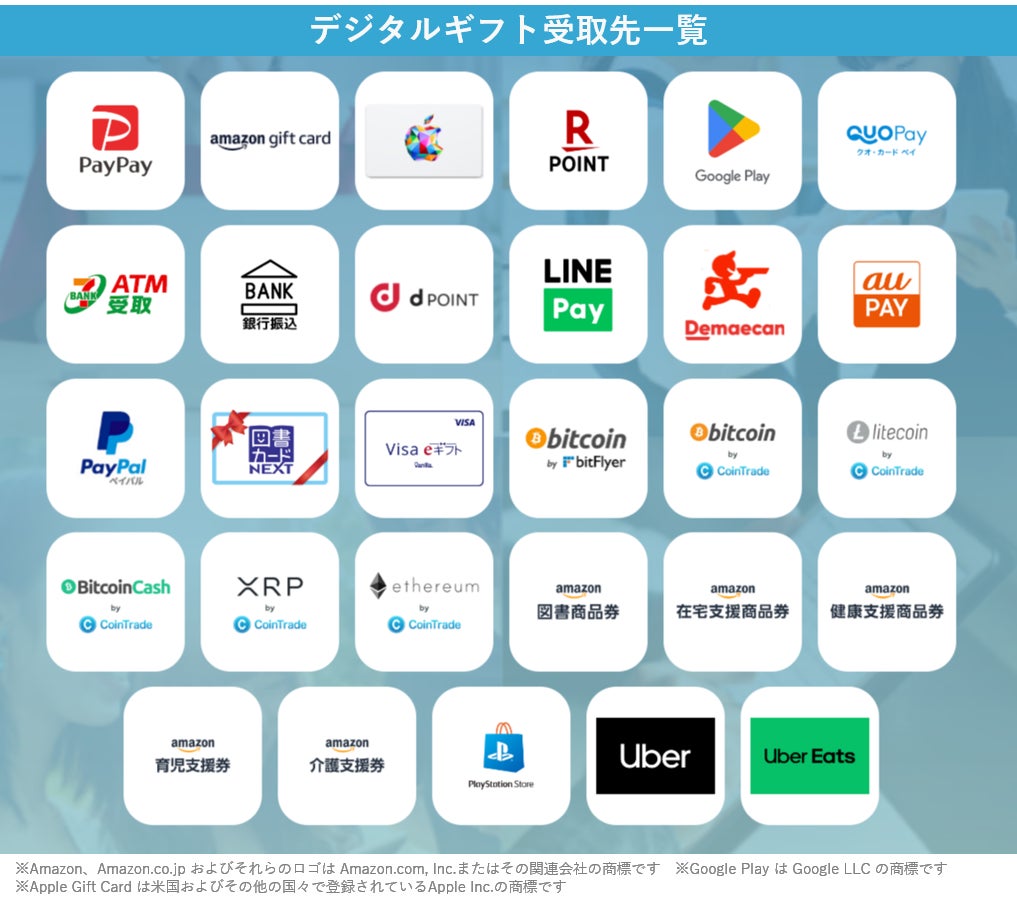 アンケート回答、資料請求、お見積もりの謝礼、社内イベントのインセンティブ、etc.