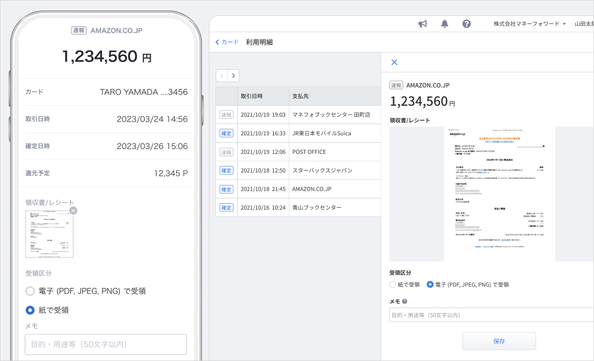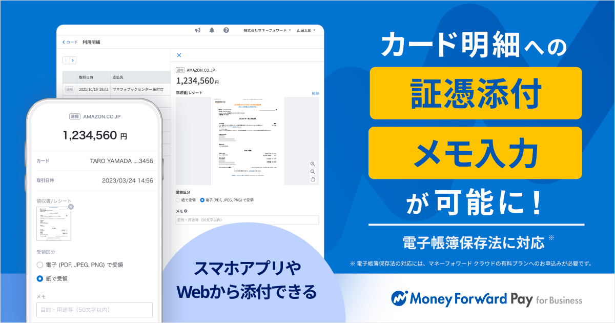 この度、『マネーフォワード Pay for Business』のスマホアプリおよびWebから、『マネーフォワード ビジネスカード』の利用明細に領収書の添付やメモの入力ができる「証憑・メモ添付機能」の提供を開始しました。本機能により、「マネーフォワード ビジネスカード」の利用用途を確認する手間の削減や、経営者や従業員の経費精算時の領収書管理の業務効率化を行うことができます。また、領収書の回収や督促に伴う経理担当者の負担を軽減できます。 なお、「証憑・メモ添付機能」を通じてアップロードした領収書は『マネーフォワード クラウドBOX』へ自動で保存され、電子帳簿保存法に則って保管を行うことができます※1。