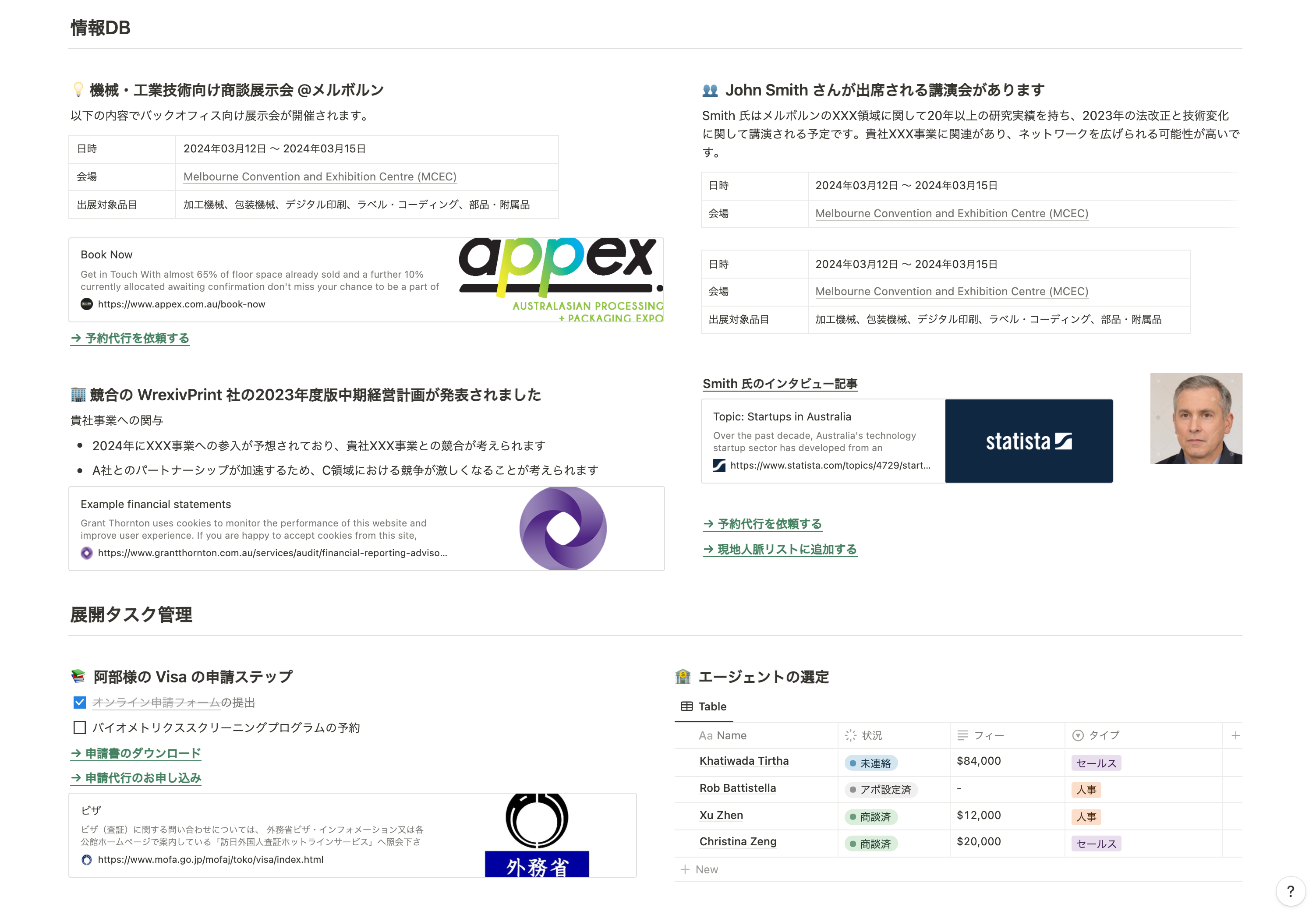 海外展開支援コンサルタントに業務をアウトソーシングして丸投げ、では知見が自社に蓄積せず、独自の戦略や取り組みを実行に移すことが難しくなってしまいます。AIが自動で収集した情報や、社内社外でのやりとりの全てを一箇所に集約し、自社ナレッジとして蓄積することで、強力なチームを作ることができます。