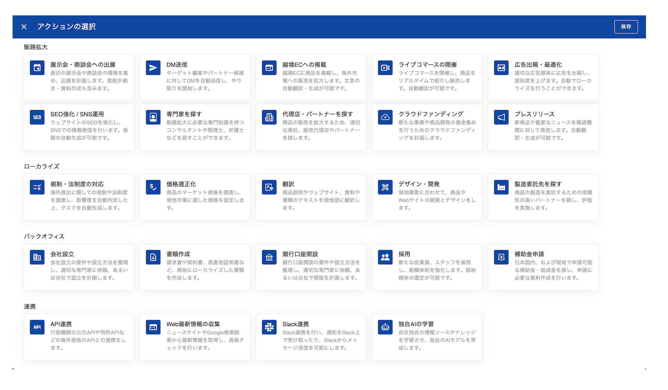 アクションを選択すると、大量の海外情報を学習済みのAIと専門コンサルタントが、業務代行、必要なタスクの洗い出し、質問回答を一括して行います。全てのやりとりはチャットで完結し、海外現地の専門家とのやりとりも、自動で翻訳・要約・文章生成をすることが可能です。