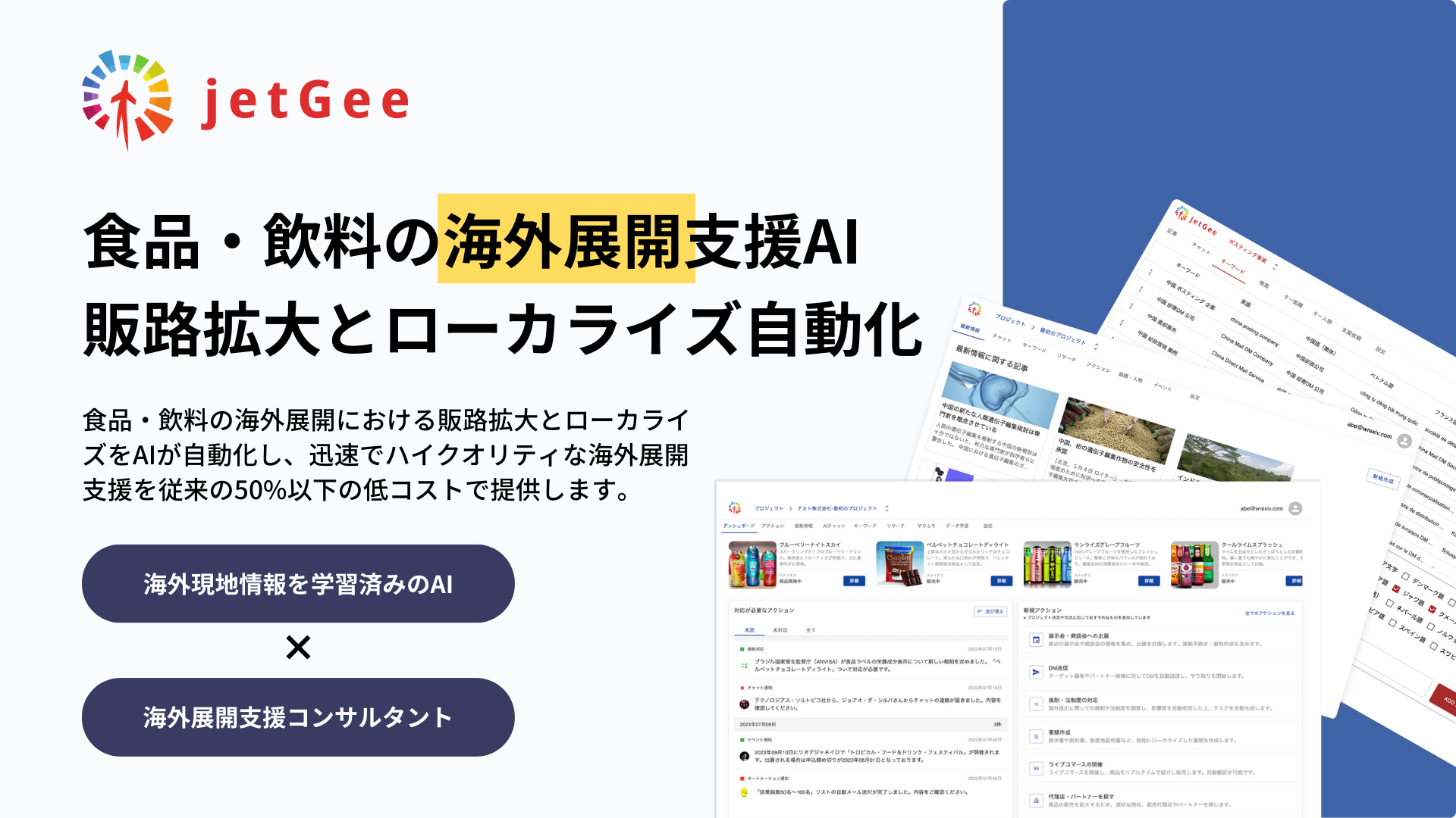日本市場の収縮に伴い、多くの食品・飲料メーカーが販路拡大を図るための海外展開を積極的に推進しています。しかしながら、言語、商習慣、法規制、市場ニーズといった要素の違いが大きな障壁となり、成功への道のりは多大なコストとともに、極めて困難なものとなっています。