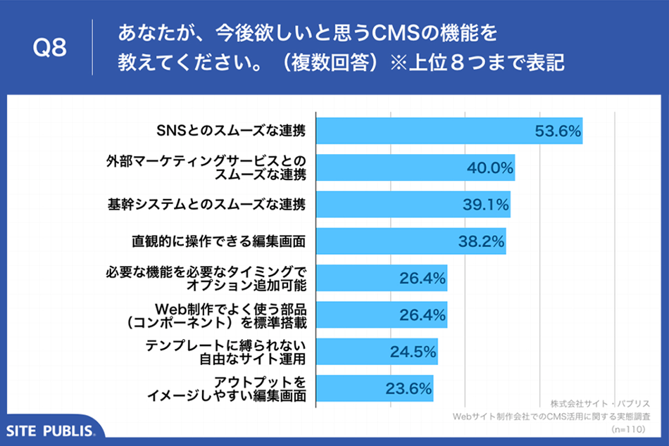 「あなたが、今後欲しいと思うCMSの機能を教えてください。(複数回答)」と質問したところ、「SNSとのスムーズな連携」が53.6%、「外部マーケティングサービスとのスムーズな連携」が40.0%、「基幹システムとのスムーズな連携」が39.1%という回答となりました。
