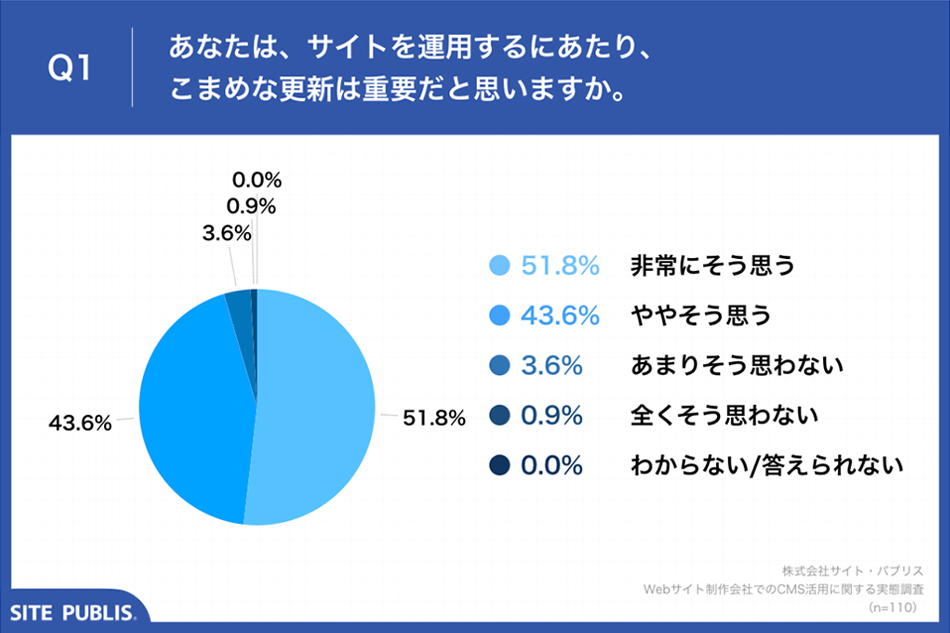 「あなたは、サイトを運用するにあたり、こまめな更新は重要だと思いますか。」と質問したところ、「非常にそう思う」が51.8%、「ややそう思う」が43.6%という回答となりました。