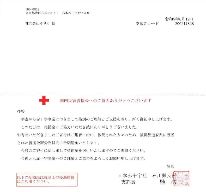 令和5年5月能登地方地震災害義援金に寄付したことをお知らせいたします。