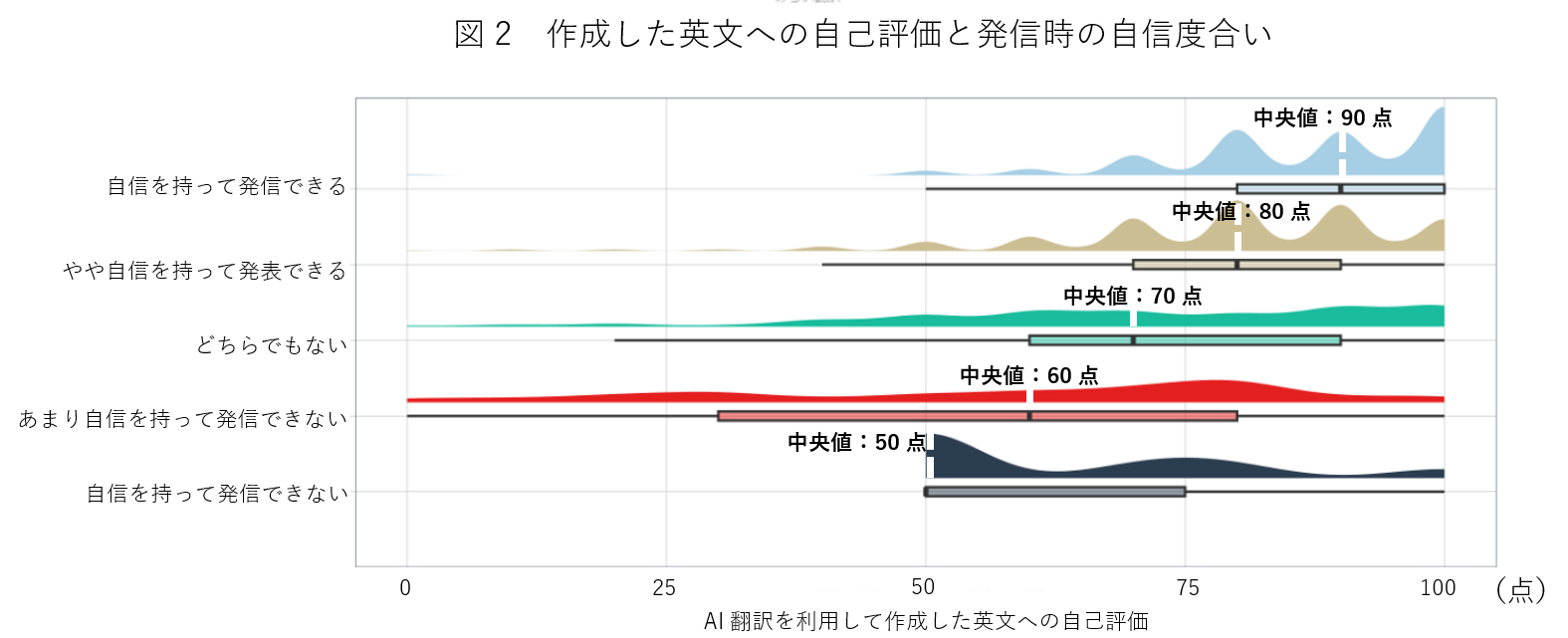 というデータが得られ、「AI翻訳を使うことで自作の英文への評価が高まり、自信を持って発表することにつながる」ということが判明いたしましたので、お知らせいたします。また、AI翻訳の使用に関する懸念点として事前に挙げられていた「英語力の低下」についても調査を行ったところ、AI翻訳の利用による英語力の低下は見られませんでした。