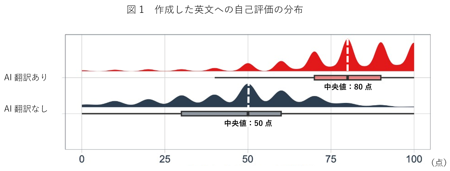 1.AI翻訳を使わない状態と比べ、AI翻訳を使っている場合では、自作の英文に対する評価が、100点満点中、30点ほど高まる