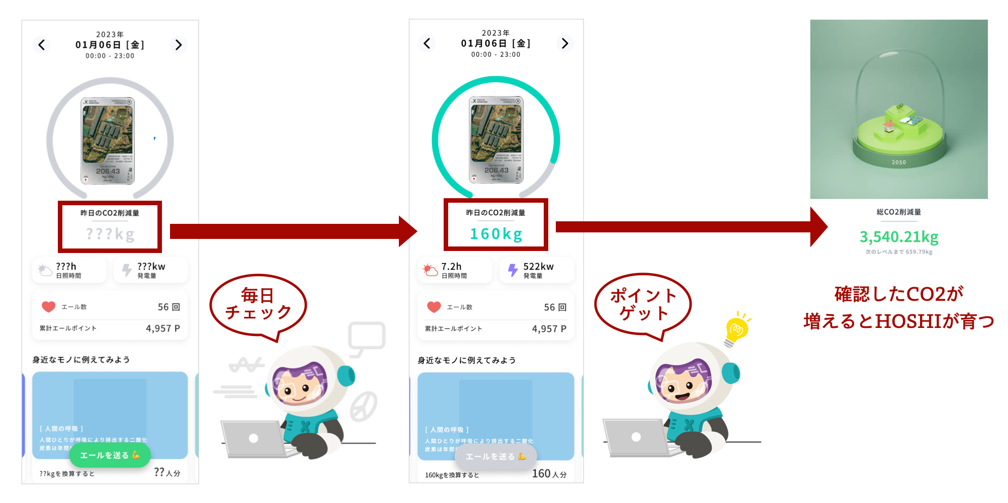 ・エールを送ることで積み上げたCO2削減量に応じてHOSHIが育つこと
