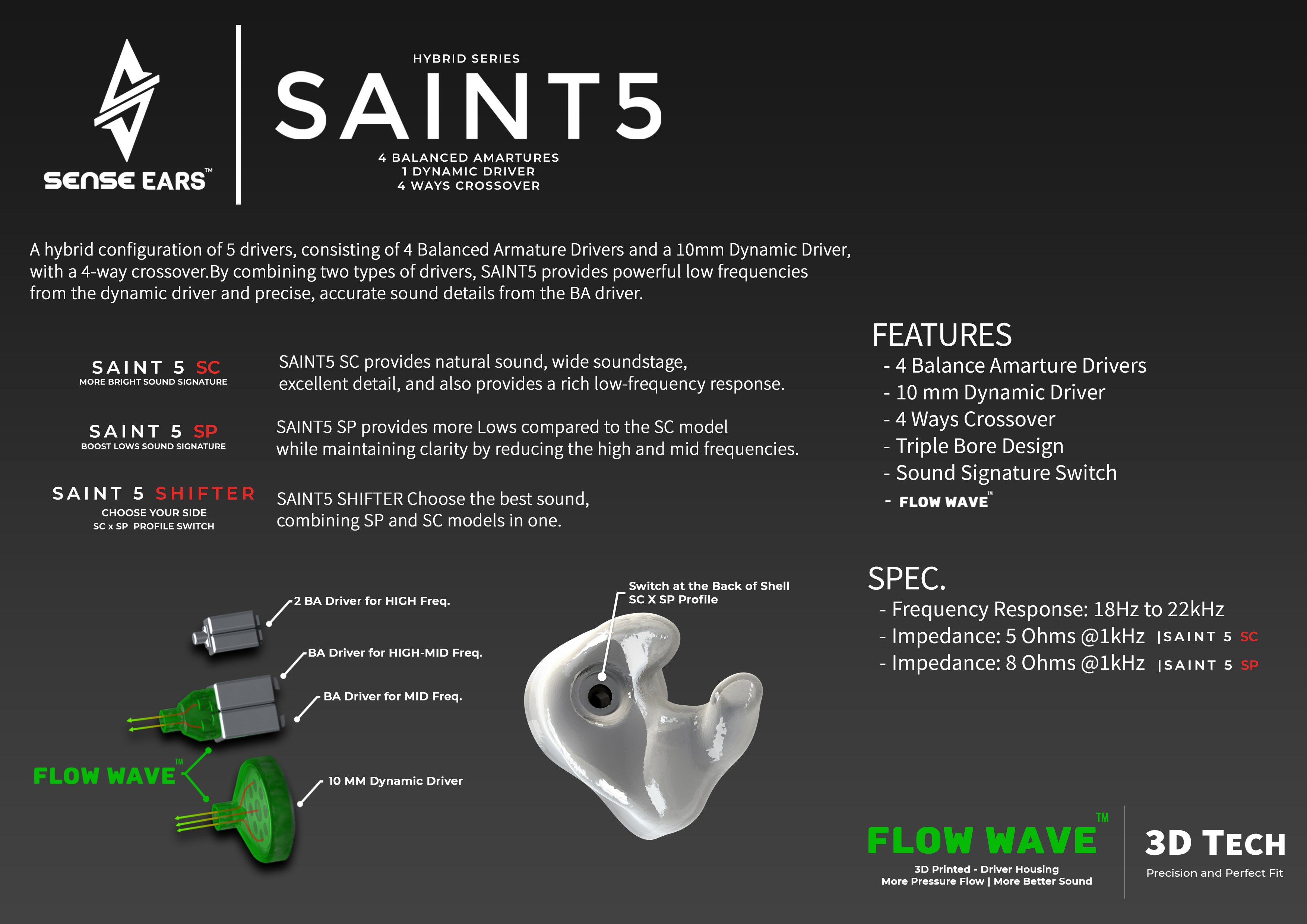 Saint5は、現在のブランドの最上位モデルで、4つのバランスド・アマチュアドライバーと 10mmダイナミックドライバーで構成される、5つのハイブリッドドライバーを使用してい ます。