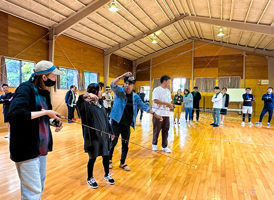 二日目は、釣りの会社ならではのレクリエーション運動会を開催。「部署の垣根を超えて」のテーマの通り、普段の部署とは関係ないメンバーでのチーム対抗を楽しみました。これらのプログラムを通じて、社員同士の連携を深め、一体感を高めることを目指しました。