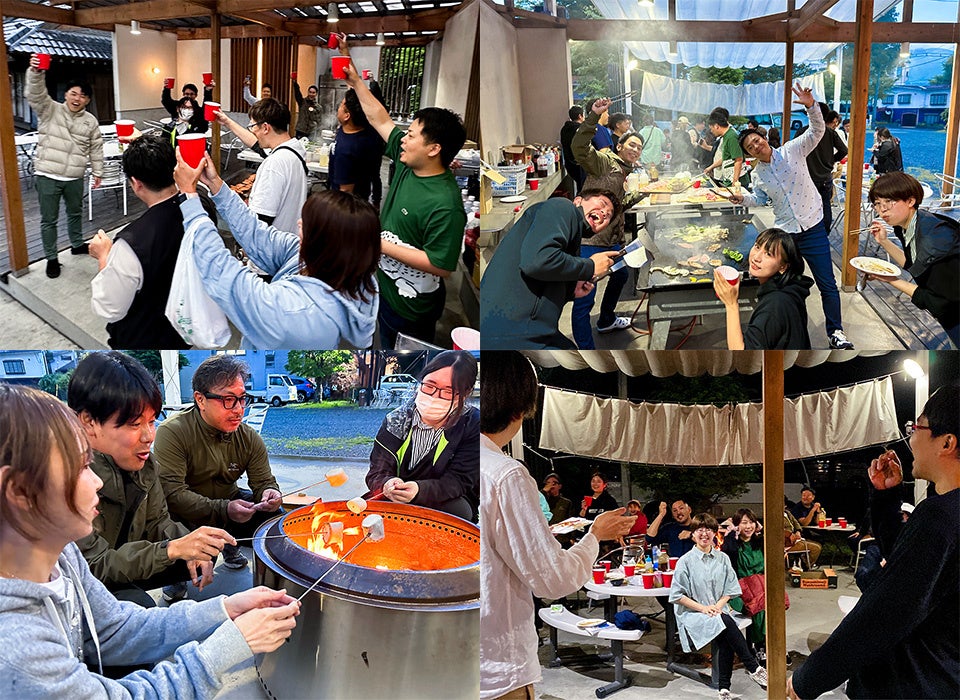 夕食のBBQでは、創業メンバーが率先している姿が印象的でした。社員の結婚祝いサプライズと共に、事前に集めたメンバーの思い出の曲を流して大盛り上がりでした。