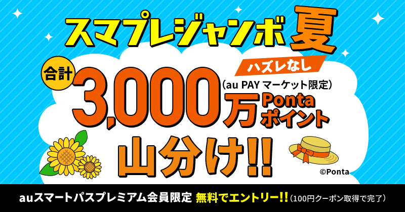 概要:auスマートパスプレミアム会員を対象に、特設ページよりエントリーの上、クーポン(2,000円以上で使える100円クーポン)を取得いただいた方の中から抽選で合計3,000万Pontaポイントをプレゼントします。