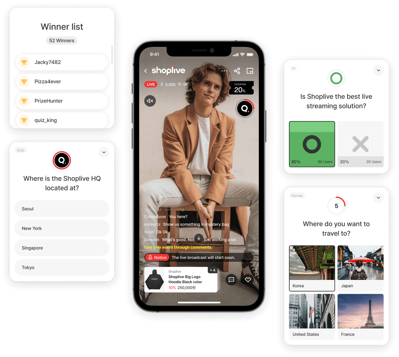 Shopliveが提供するライブコマースソリューションは、各企業専用のUI/UXカスタマイズを提供し、シンプルなJavaScriptコードを挿入するだけでインストールが可能です。さらに、iOS、AndroidのSDKを適用すると、OS PIP(Picture-in-Picture)やHorizontal mode(横向きの全画面モード)などを実装することができます。また、さまざまなコミュニケーション機能(オークション、クイズ、抽選、コメント抽選、クーポンなど)を提供し、顧客との積極的なコミュニケーションを通じてクライアントの売上に貢献できる機能を備えています。