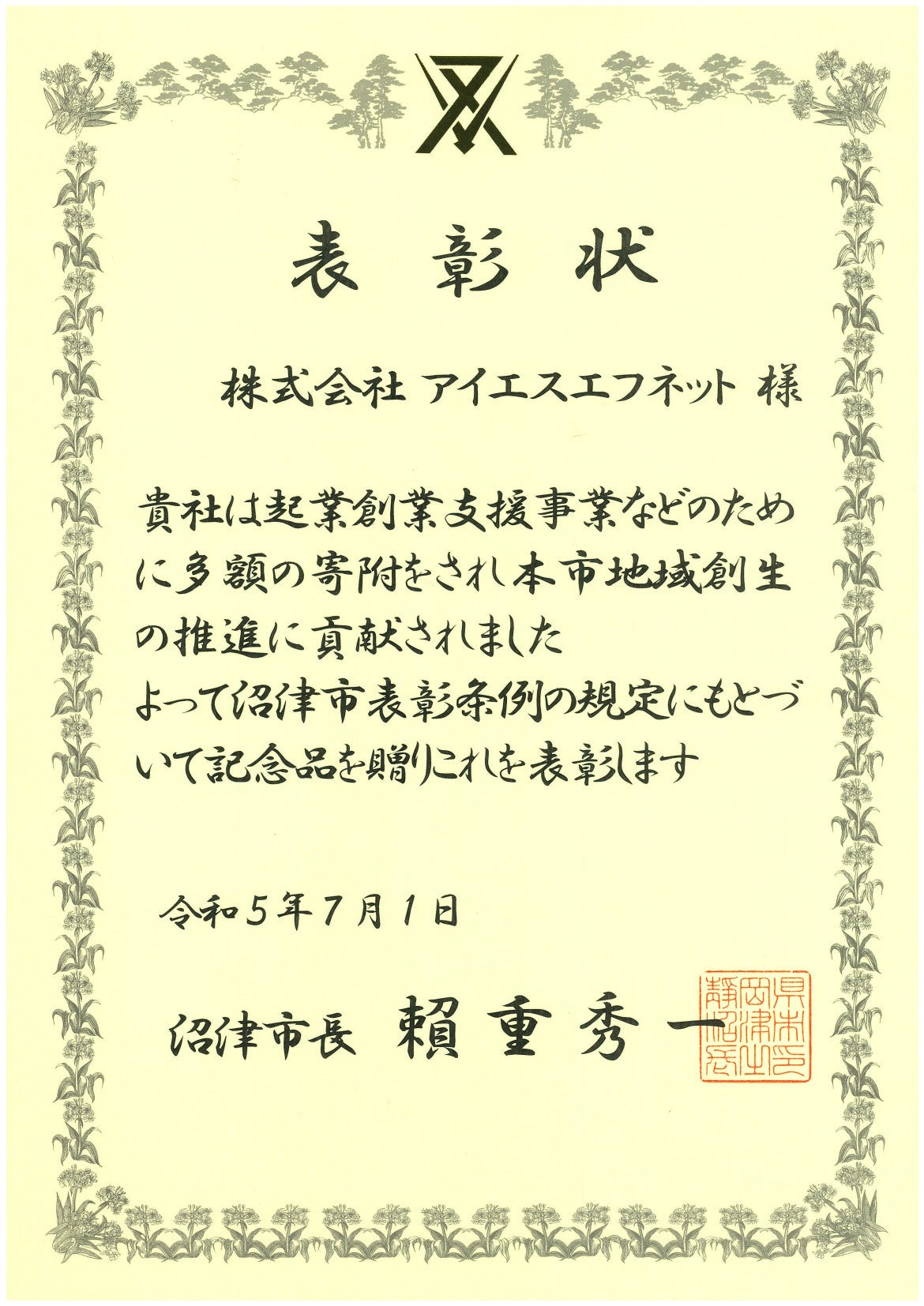 アイエスエフネットは、この度地域創生推進のために「企業版ふるさと納税」を活用し沼津市に寄付したとして、7月1日に行われた沼津市制施行100周年記念式典において寄附功労の表彰をいただきました。