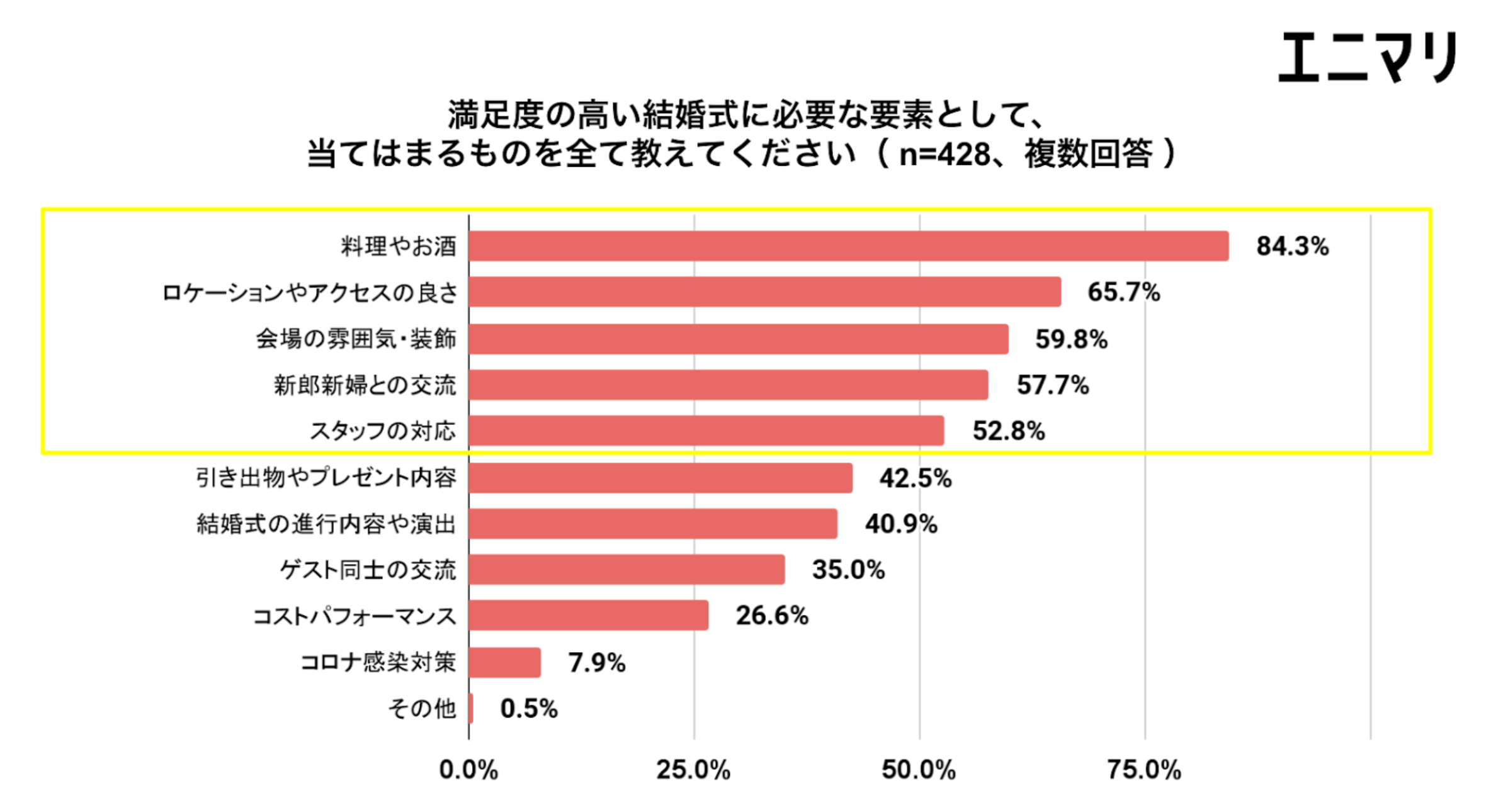 2023年4月にエニマリが実施した「結婚式への参加」に関するアンケート調査結果※によると、「招待ゲスト」からの満足度の高い結婚式に必要な要素は「料理やお酒」との回答が8割強で最も多く、次いで「ロケーションやアクセスの良さ」「会場の雰囲気・装飾」「新郎新婦との交流」「スタッフの対応」の順で並びました。今回の「招待ゲスト満足度」ランキング結果においても、新郎新婦がゲストへのおもてなしとして提供した「料理」の満足度が高い会場や、ホスピタリティを含めた「会場の雰囲気」の満足度が高い会場などがランキングの上位に入り、関連した口コミが多く寄せられました。