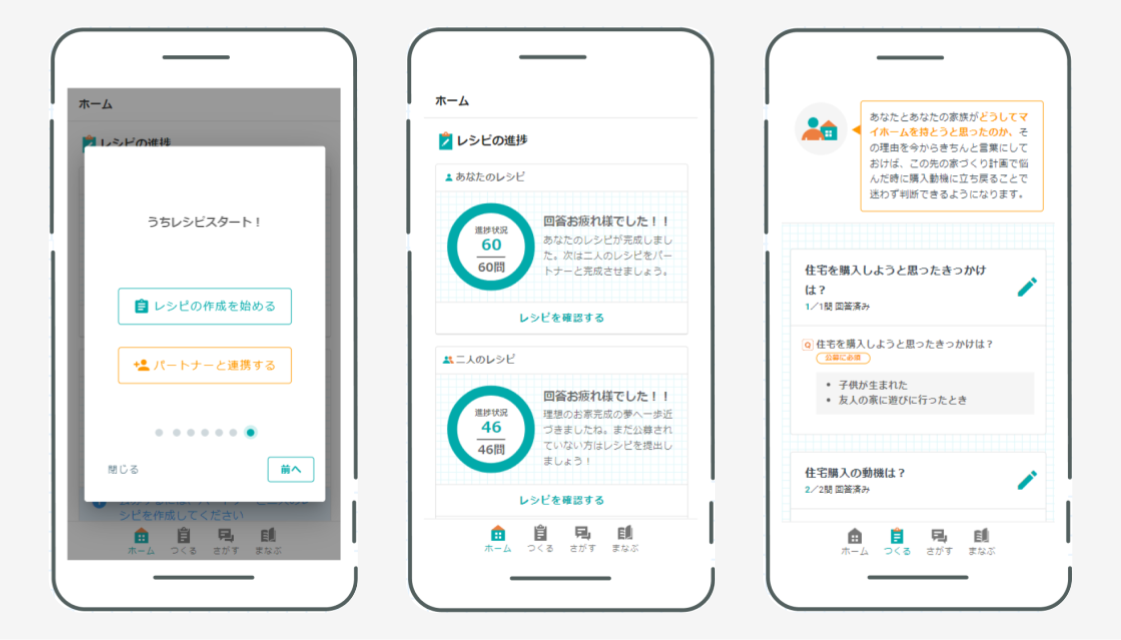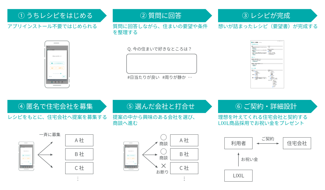 そこでLIXILは、住宅購入希望者の抱える家づくりの悩みと住宅会社の集客課題を解決することを目的とした、ウェブサービス「うちレシピ」を開発いたしました。ユーザーが「うちレシピ」上で住宅購入に必要な情報を収集し、理想とする暮らしの要望や条件などを入力すると、条件が整理された家づくりの「レシピ」が作成されます。そしてその「レシピ」を「うちレシピ」と契約する住宅会社へ公開。住宅購入希望者は連絡のあった住宅会社の中から気になる会社を選び商談へ進むというのがサービスの概要です。これにより住宅購入希望者はサービス上で自分の希望条件を満たす住宅会社を探すことができるようになり、主体性を持って住宅の購入を検討できるようになり、住宅購入前の悩みの解決や住宅購入後の後悔を回避することに繋がります。さらに、ユーザーは住宅の購入契約時にLIXIL製品を採用することで、最大30万円のお祝い金を受けられるという特典(※2)も。住宅会社においても、新規の見込み客への提案の機会が増え、集客課題の解決に繋がります。