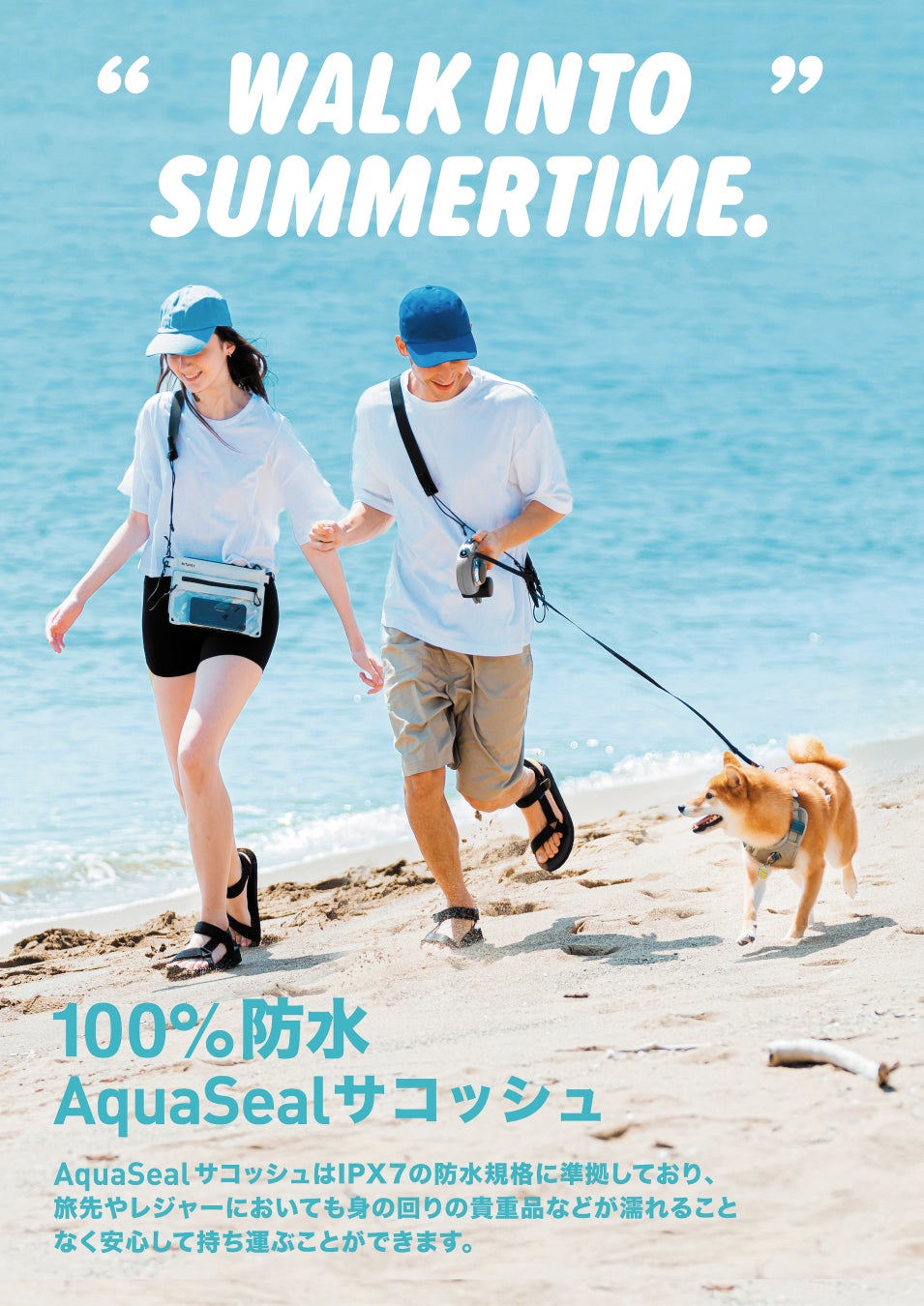 夏の絶対的な必需品、bitplay AquaSealが新しくなってAquaSealサコッシュとして登場!AquaSealサコッシュは、従来より高い信頼性の防水ファスナーを採用し、IPX7の防水規格に準拠し、旅の間中、必需品を濡らさず、安全に持ち運びできます。スマートフォンを入れたままでも写真撮影や操作ができ、マチが出来たことで容量もより大きく便利になりました。