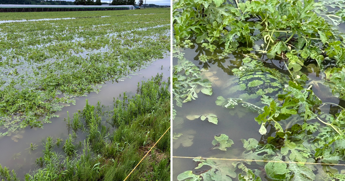 畑が8割程度水没し収穫できるかどうかわからない状況です。例年の収穫量の7割ほどの減少が見込まれ、被害額は1億円ほどになりそうです。収穫まであと数日だったので非常に残念ですが、人間の力で防げるような出来事ではないので仕方がないと思っています。