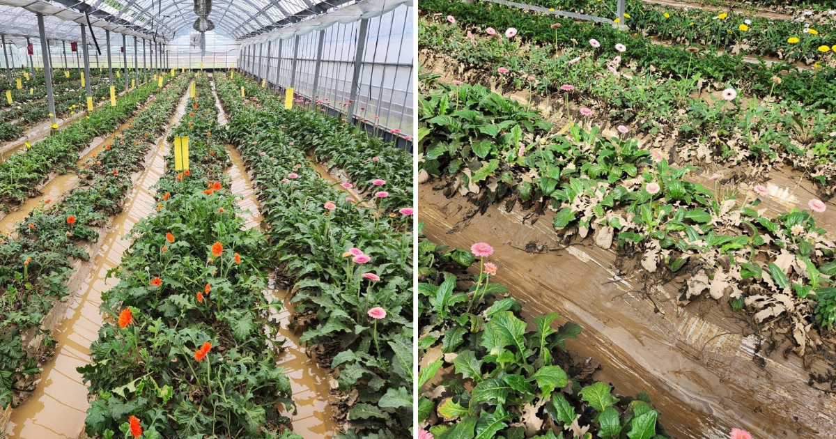 450坪のガーベラのハウスが浸水し全滅しました。今年植えたガーベラはかろうじて無事で8月には出荷できる見込みです。令和元年の豪雨災害で8割のガーベラが被害を受け何とか復興を果たした矢先に2度目の豪雨被害となりました。何とか今回も復興に向けて頑張りたいと思います。