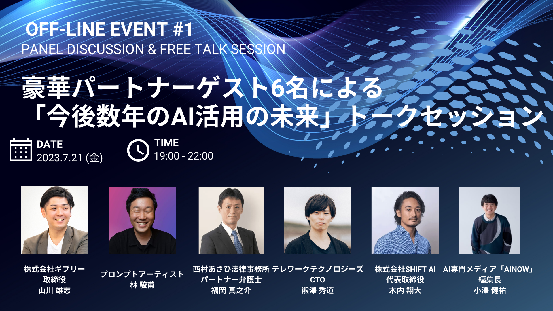 第1回目となる今回は、法人におけるAI活用、プロンプトデザイン、AI研修、法規制など、各方面のトップランナーであるパートナー様を複数名を交えて、パネルディスカッション&質疑応答を行い、その後、情報交換を兼ねた懇親会を実施いたします。AIに関する専門家とパートナーが一同に会し、幅広いテーマについて議論を深められるイベントとなっていますので興味がある方はぜひご参加ください。