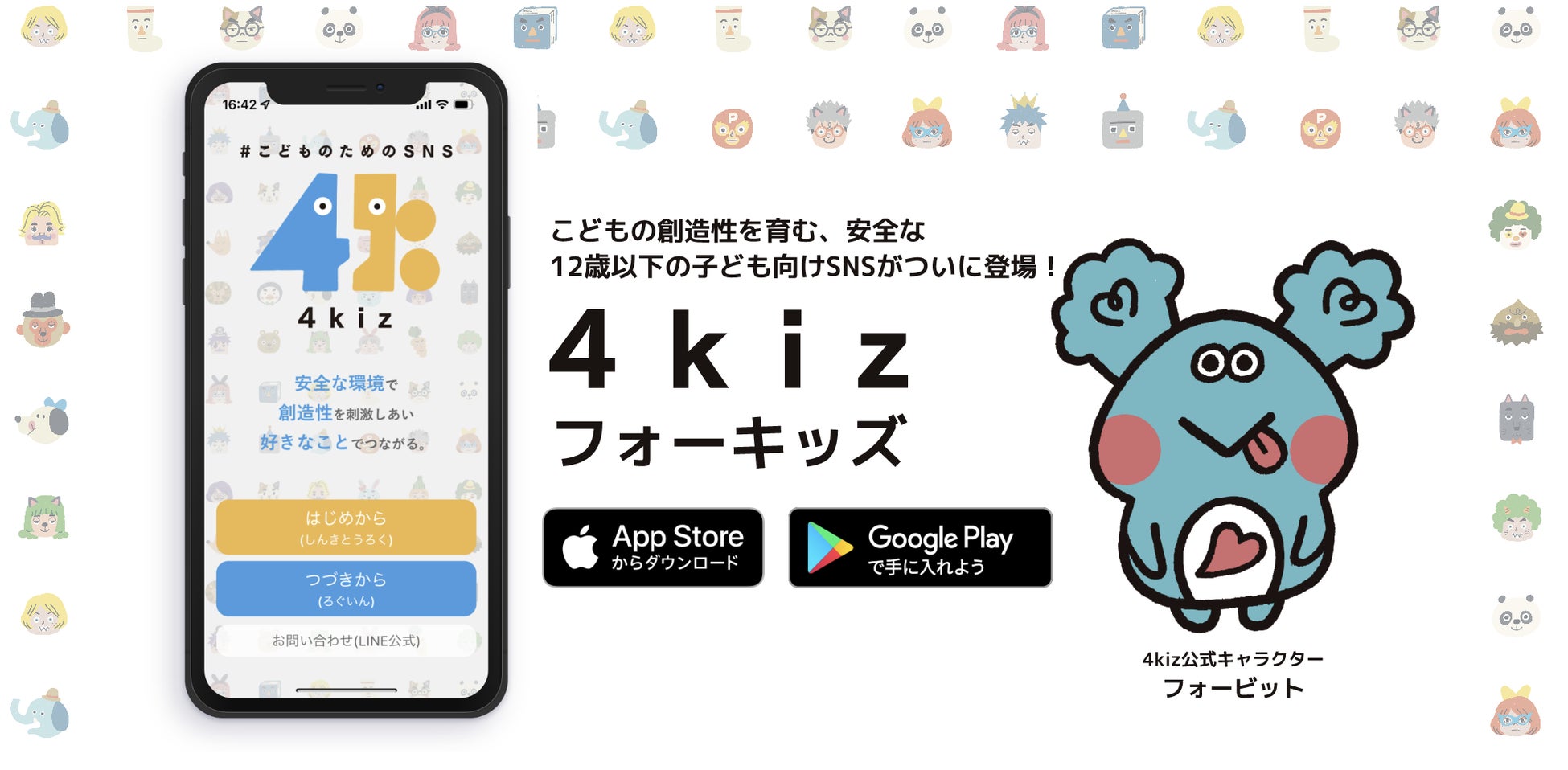 4kizは、「こどもたちの可能性を無限に引き出す世界中のつながりをつくる。」をミッションに掲げ、本SNSを通して、子どもたちが好きなことでつながり合うことで好奇心を伸ばし、創作品をシェアし合うことで創造性を育むことを目指しています。