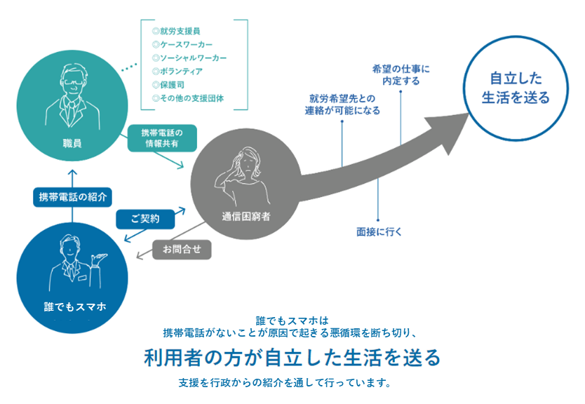 日本には、携帯電話が持てないことで仕事・住まいが確保できない「通信困窮者」がおよそ500万人いるとされています。『誰でもスマホ』は、こういった通信困窮問題の改善に向けて各支援施設との関係を築いています。