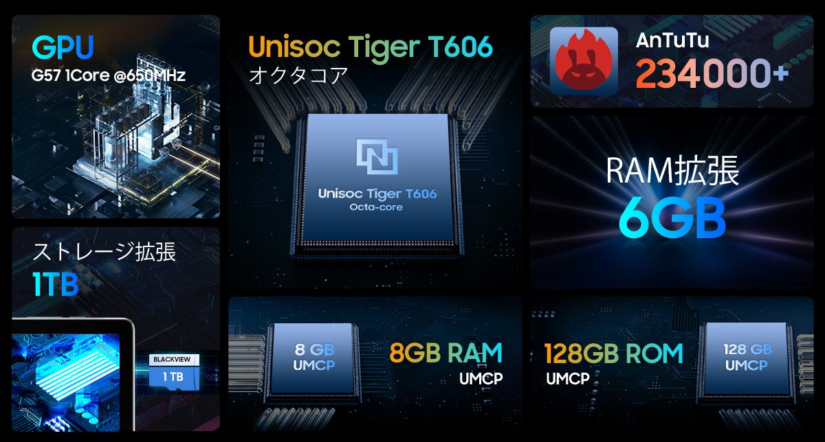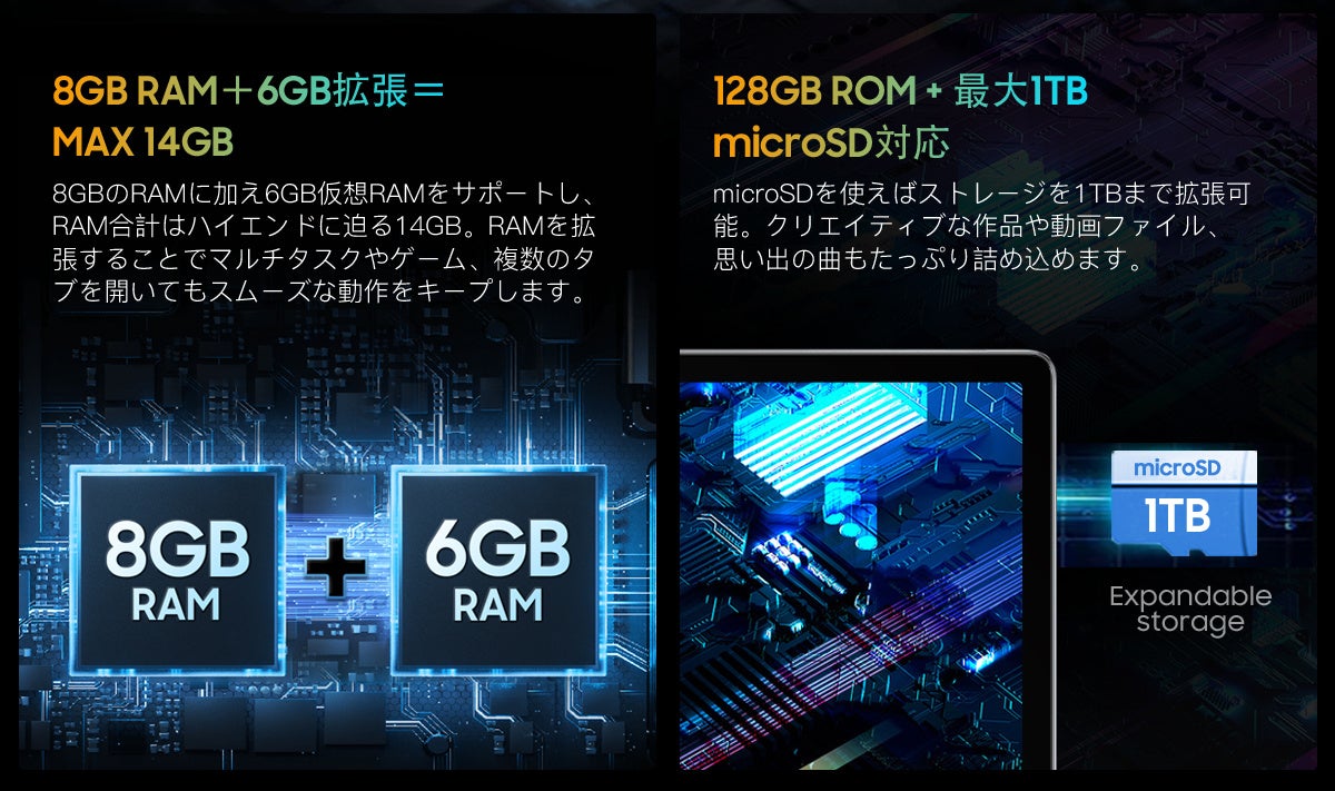 - 大容量メモリ(14GB(8GB+6GB拡張)RAM+128GB ROM+1TB TF拡張)