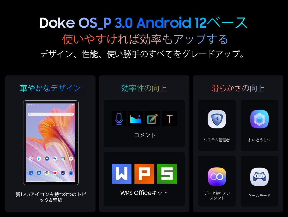 Blackview Tab12Pro タブレット 10インチインセルディスプレイ FHDには最新の Android 12 システムが搭載されており、システムの相互作用設計が簡素化され、タブレット Android 12 がよりスムーズかつ高速に動作するだけでなく、よりパーソナライズされた、安全で操作が簡単なシステム経験。 ユーザーは、UI の配色とウィジェットを自由にカスタマイズできます。 クリック、スワイプ、スクロールもスムーズです。 また、Google の GMS 認定を受けているため、プリインストールされた Google Play ストアからお気に入りのすべてのアプリにアクセスできます。 また、画面分割機能対応やデバイスコントロール、画面収録などの新機能により、タブレット操作がよりスムーズに。