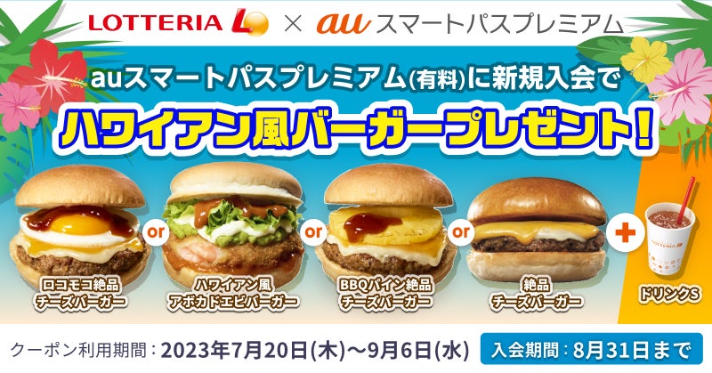 この度、キャンペーンサイトより 「auスマートパスプレミアム」に2023年7月15日~8月31日に入会いただいた新規会員を対象に、全国のロッテリア(※1)で使えるハワイアン風バーガーとドリンクがセットになったクーポンをプレゼントします。※1一部店舗を除く