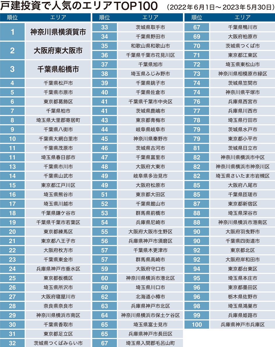 ・「戸建投資で人気のエリアTOP100」の1位は「神奈川県横須賀市」、2位が「大阪府東大阪市」、3位が「千葉県船橋市」という結果に