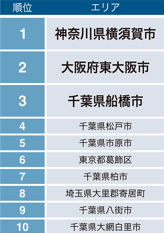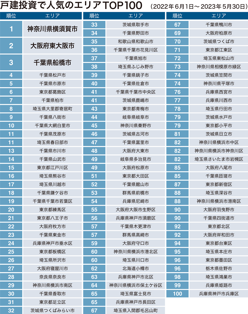 ・「戸建投資で人気のエリアTOP100」の1位は「神奈川県横須賀市」、2位が「大阪府東大阪市」、3位が「千葉県船橋市」という結果に