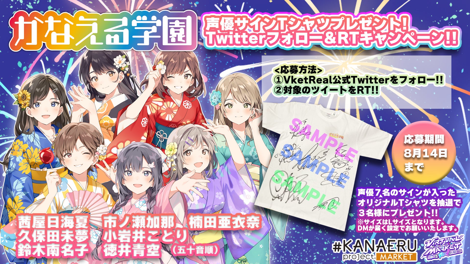 バーチャルマーケット公式Twitterをフォロー&対象のキャンペーンツイートをリツイートしてくれた方の中から抽選で3名様に、かなえる学園オリジナルボイスドラマCDに出演した7名(小岩井ことり/楠田亜衣奈/茜屋日海夏/久保田未夢/市ノ瀬加那/徳井青空/鈴木南名子)のサイン入りTシャツをプレゼントします!