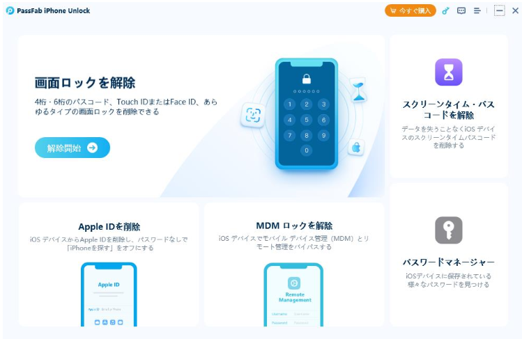 パソコンでiPadパスコードを解除する方法として、まずご紹介するのは専門ソフトPassFab iPhone Unlockを使う方法です。PassFab iPhone UnlockはパスワードなしでiPhone/iPadの画面ロック、スクリーンタイムパスワード、Apple IDのロックを解除するソフトです。iPhone/iPadのパスコードを忘れてロックを解除できない場合、同ソフトを使うと誰でも簡単に画面ロックを解除できます。また、すべてのiOSバージョンとデバイスに対応(iOS17 Betaにも対応)できます。以下は詳しい操作方法でご確認ください。