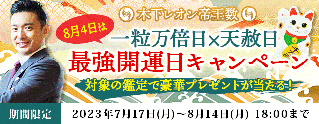 フジテレビ系列で放送中の占い番組『突然ですが占ってもいいですか?』で人気を博している木下レオン。ただいま、月額公式サイト『木下レオン◆帝王数』にて、来る8月4日が一粒万倍日と天赦日が重なった最強開運日であることから豪華プレゼントが当たる『最強開運日キャンペーン』を開催中です。キャンペーン期間中、対象の占いメニューを購入し特設ページから応募すると、あなたの誕生石を使ったプレスレットが抽選で当たります。ぜひこの機会にお試しください。