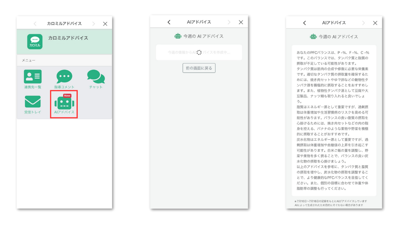 指導対象者は、「カロミル」より連携済みサービス「カロミルアドバイス」のポータル画面から、「AIアドバイス」をタップするだけで、その週の食事傾向を元にしたアドバイスを受けることができます。指導者は、管理画面から表示内容を確認することができ、その後の指導に役立てることも可能です。