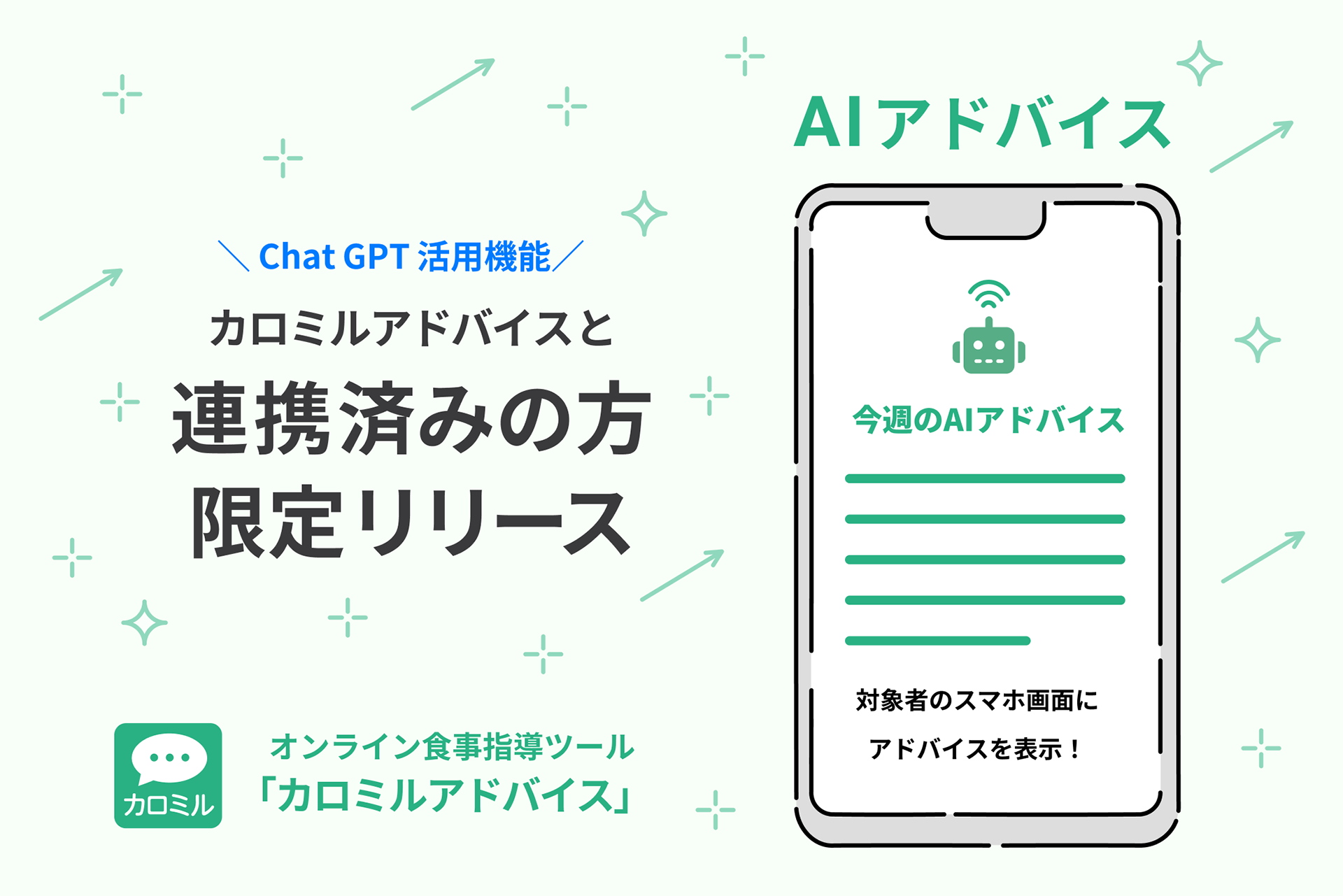 Open AIが開発した「Chat GPT」を活用した「AIアドバイス」は、「より質の高い栄養指導を行いたいが、具体的にどのような食事指導をすればいいのかわからない」「業務の中でコメントの文を1から作成するのが大変」など、食事指導における課題や業務効率化に対する声を多くいただいたことを受け、2023年6月にリリースした指導者向けツール「カロミルアドバイス」の新機能です。