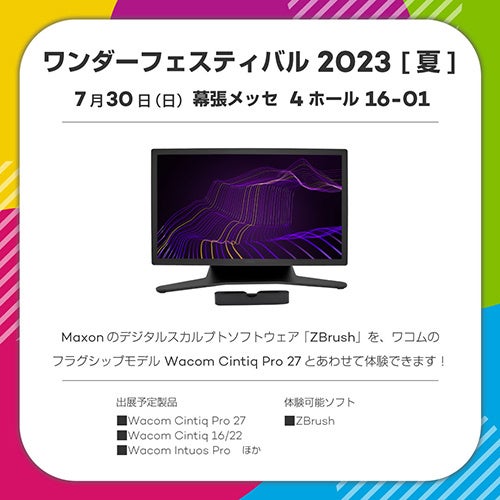株式会社ワコムは、7 月 30 日(日)に幕張メッセ(千葉県千葉市)で開催される、世界最大級の造形・フィギュアの祭典 『ワンダーフェスティバル 2023[夏]』で、一般社団法人3Dデータを活用する会・3D-GAN、Maxon Computer株式会社と共同出展します。(3D-GANブース:4ホール 16-01)