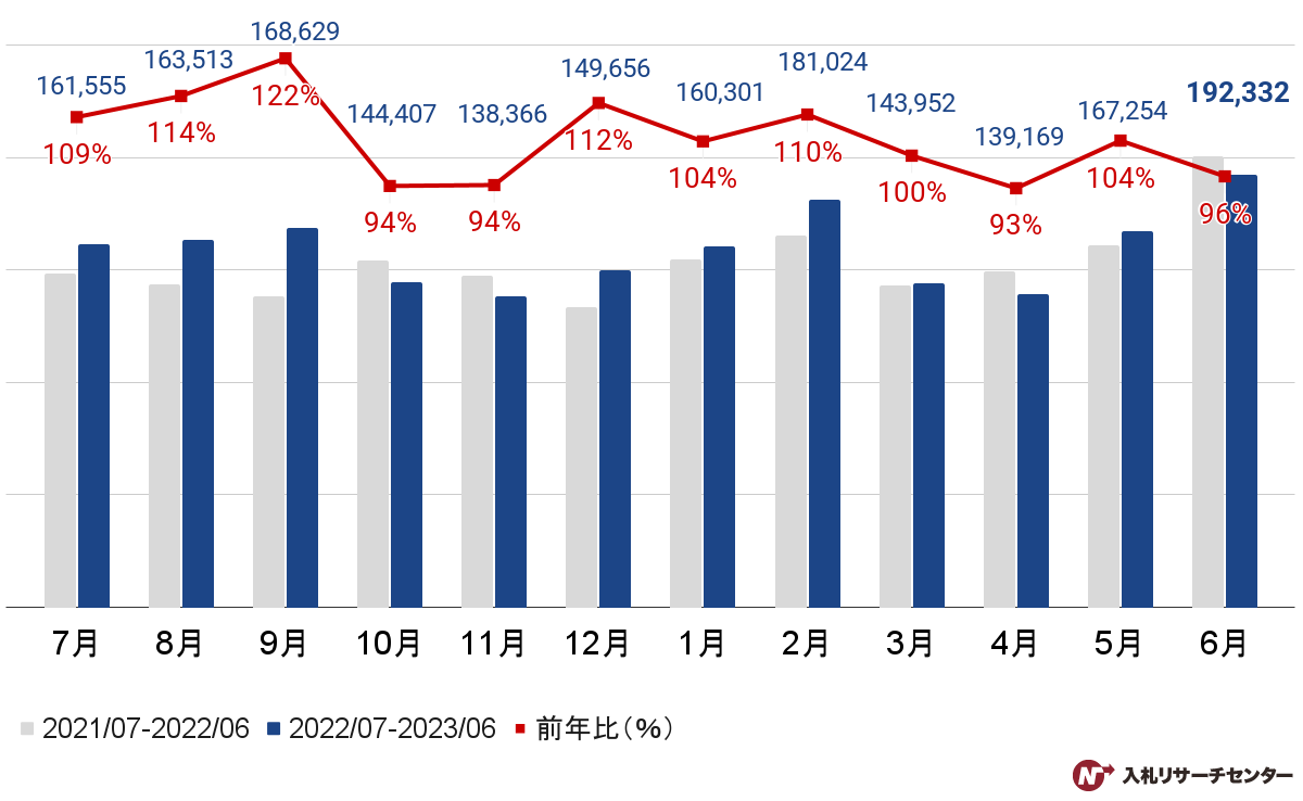 2023年6月の公示案件数の総計は192,332件で、前年比96%となりました。